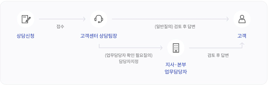 상담신청이 접수되면 고객센터 상담팀장이 검투후 답변을 드리거나, 지사 본부의 업무담당자가 답변을 달아 드립니다