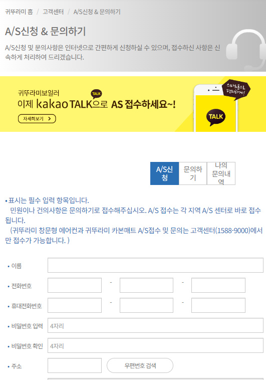 카카오톡 신청은 귀뚜라미보일러 고객센터 전화번호 1588-9000번으로 하시면됩니다 카카오톡 접수를 선택하시고 카카오톡 as 접수하기 버튼을 눌러 진행하시면됩니다