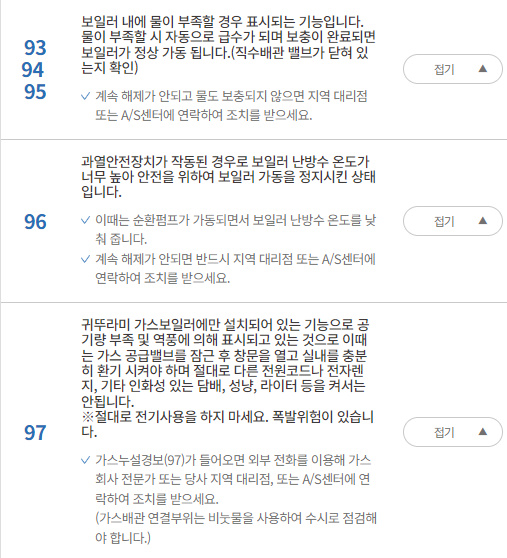 93 94 95 에러코드는 보일러내에 물이 부족한 경우 표시됩니다 물의 밸브가 잠겨있는지 확인바랍니다 물이 보충이 되지않는다면 as 받으셔야 합니다